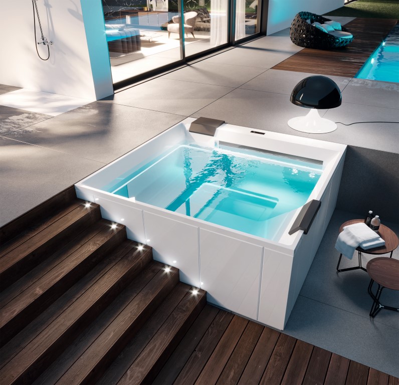 Minipiscina SPA cu sistem de hidromasaj ascuns, unic in lume (GHOST SYSTEM), cu 40 jeturi hidromasaj, cu cromoterapie pe perimetrul superior si sistem de recirculare automata a apei.